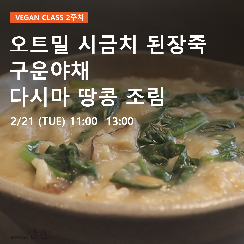 2월 21일(화) 11:00~13:00 : 속이 편한 아침! (오트밀 시금치 된장죽, 구운야채, 다시마 땅콩 조림
