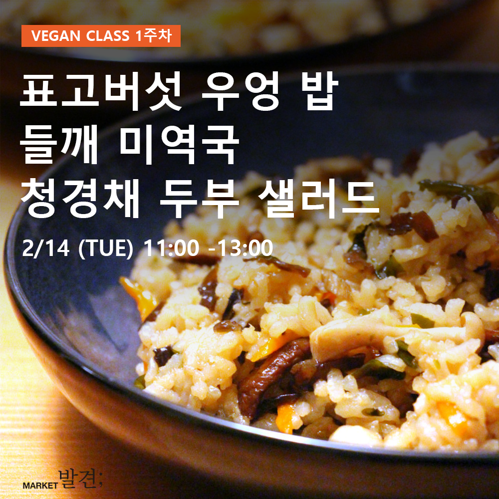 2월 14일(화) 11:00~13:00 : 채식! 어렵지 않아요(표고버섯 우엉 밥, 들깨 미역국, 청경채 두부 샐러드)