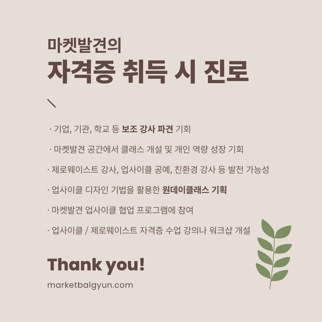 취득 후에도 본인의 역량만 뛰어나다면 마켓발견과 함께 환경을 위한 전문 강사로 활동할 수 있는 기회입니다.